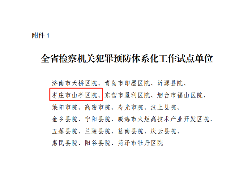 近日,山亭区人民检察院被山东省人民检察院确定为全省检察机关犯罪预防体系化工作试点单位,为全市检察系统唯一试点单位。 下一步,山亭区人民检察院将以此为契机,坚持以习近平新时代中国特色社会主义思想为指导,深入学习贯彻习近平法治思想和习近平总书记关于预防青少年违法犯罪的重要指示精神,认真贯彻最高检、省市院关于未成年人犯罪预防和治理的部署要求,全面落实未成年人保护法、预防未成年人犯罪法和家庭教育促进法的各项规定,持续深入推进预防未成年人犯罪工作,进一步健全完善预防未成年人犯罪工作体系,促进未成年人健康成长。