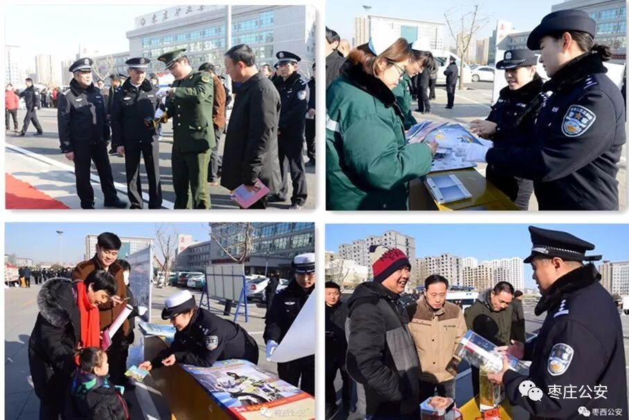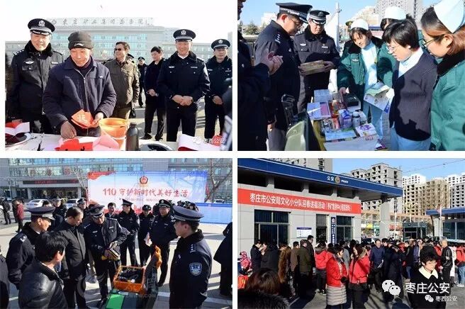 2018年1月10日是第32个全国“110宣传日”,市公安局在枣矿集团总医院以“110,守护新时代美好生活”为主题,组织开展集中宣传活动,取得了良好的社会效果。 市局领导黄健、张鹏翔和枣西分局、枣矿集团相关负责人深入枣矿集团中心医院宣传现场,观看了宣传展板和实物展示,听取了各单位讲解介绍,与民警和群众交流互动,并就警企联动、应急处突工作进行了深入探讨。 参展单位将举办“110宣传日”作为加深警民沟通、展示良好形象的有利契机,突出“利剑安民”百日会战、非警务警情分流、重要安全防范常识等3项重点,专门设计制作宣传海报、挂历、展板等宣传资料,向过往群众热情介绍公安机关在打击犯罪、社会管理、便民利民工作中取得的丰硕战果,积极展示新型高科技警用装备。 非警务求助事项分流工作展示牌 枣庄公安民生警务中心 枣庄公安系列新媒体品牌 (微信服务号+微信订阅号+新浪微博+今日头条号) 通过市局官方微博“@枣庄公安”现场实时信息发布 假冒伪劣药品展示现场 缴获的毒品及吸毒器具 警用枪支展示 无人机现场演示 特警作战车辆 民警现场讲解宣传 多名警营书画家在宣传现场,挥毫泼墨,以笔寄意,为广大人民群众书写春联、书法作品,向现场群众送去春节祝福。 期间,枣矿中心医院急救中心、枣矿集团矿山救护队携装列阵,全程参与了本次宣传活动,生动展现了警企联动、警医互助的深厚情谊。