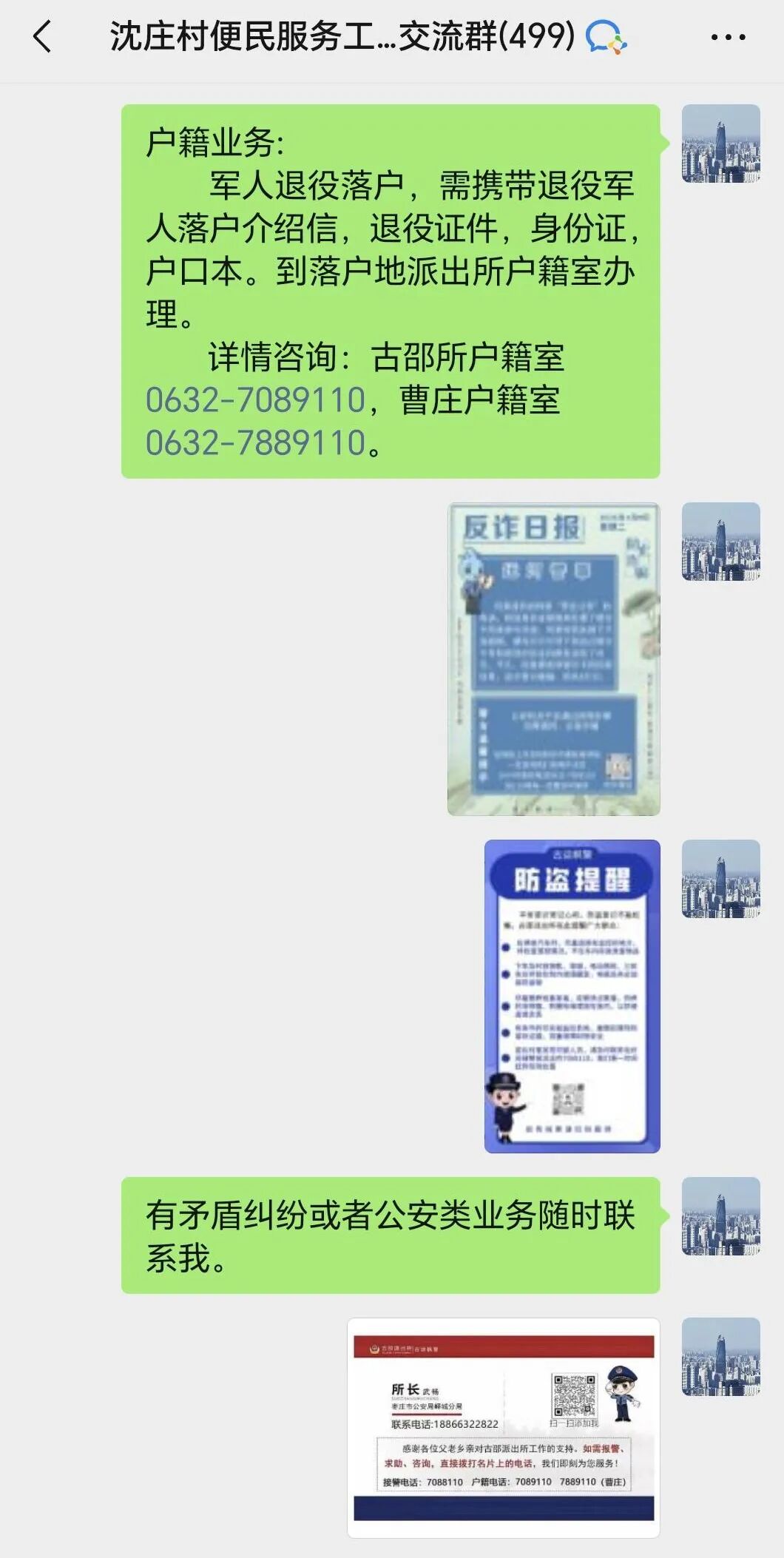他们还把反诈知识编成节奏感十足的快板词,在集市、广场上,巡逻间隙,手腕轻转间打出明快节拍,总能吸引男女老少跟着打拍子、学知识,大家直呼“听得懂、记得牢”。同时,为优化偏远地区户政服务,派出所升级打造了曹庄警务室户籍办理点。八里沟村是辖区最偏远的行政村,以前这里的村民需专门前往派出所办理户政业务,如今有了这个户籍办理点,使得这个村子村民办理户政业务共缩减40余公里路程,办事更省心高效,也减少了交通安全隐患。为进一步延伸服务触角,派出所深入推进“指尖警务”工作机制,所里每个民辅警都加入辖区各行业、社区的微信群。“今天给大家说个新骗局,有人冒充客服说你的快递丢失要理赔……”派出所每天自制“反诈日报”,把新骗术、防范要点编成图文并茂的海报,民辅警在群里每天定时推送,大家看到后随手转发,传到“家庭群”“工作群”“亲友群”,指尖滑动间,防骗知识成了大家随时能看的“安全指南”。不仅是反诈提醒,在一个个“线上警务室”里,户籍业务及时答、矛盾纠纷有人调、线索反映不拖延,只要群众有问题、有困难,只需在群里发个消息,这些求助、诉求就快速汇集到了民辅警的眼前。同时,一条条反馈结果也及时地传递到群众手中。