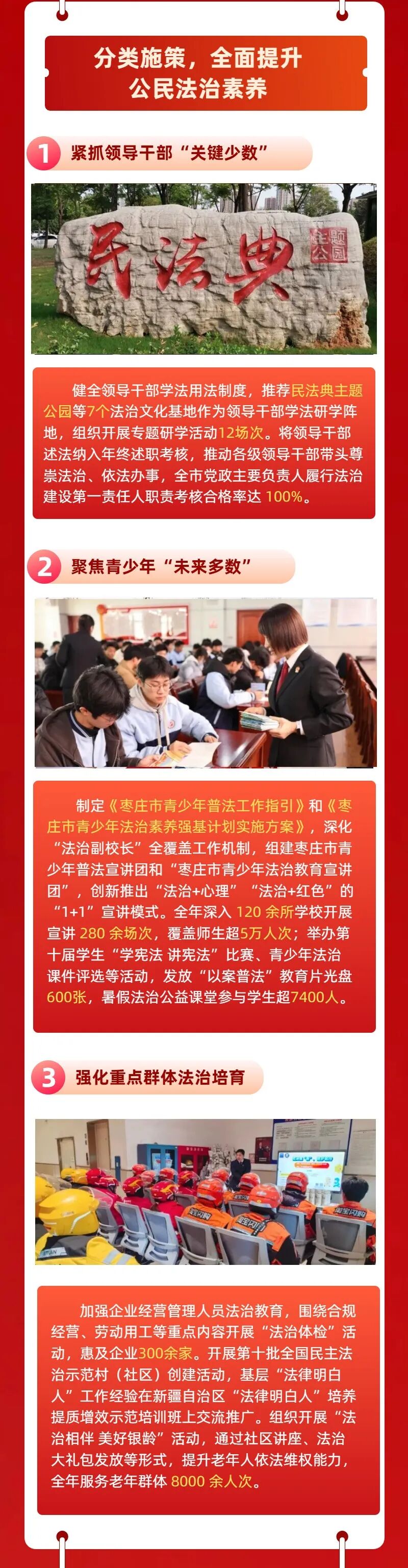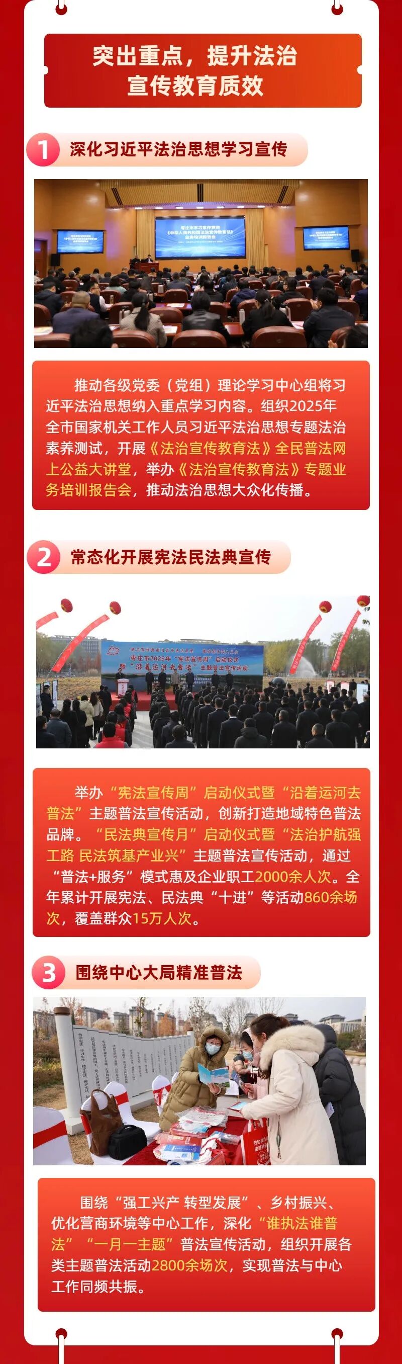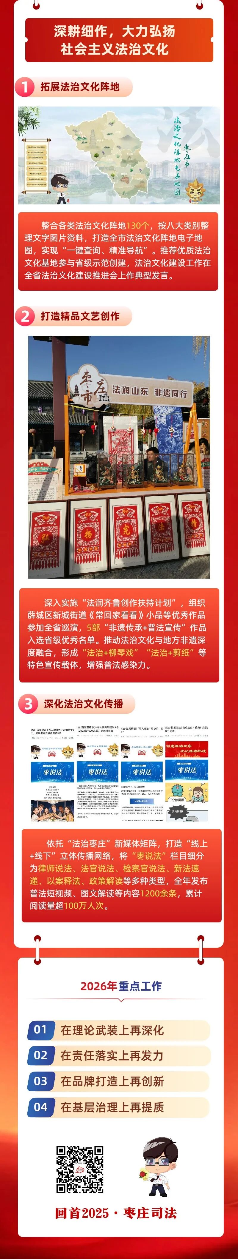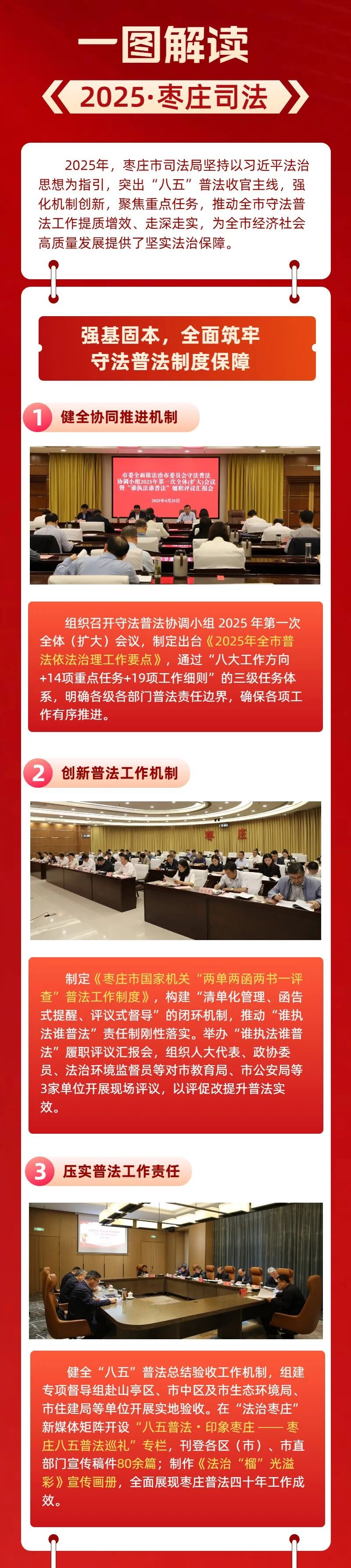 编者按 回望来路,只争朝夕。法治筑根基,实干谱新篇。2025年,枣庄市司法局始终以习近平法治思想为指引,锚定市委、市政府中心工作,紧扣“法治枣庄”建设主线,坚守司法行政初心使命,在全面依法治市、法治政府建设、公共法律服务、基层社会治理、机关党的建设等各个领域深耕细作、奋勇争先,交出了一份有力度、有温度、有实效的法治答卷。 为回望耕耘之路,展现奋进成果,我们特开辟“回首2025·枣庄司法”专题栏目,陆续刊发全市司法行政系统各项工作的实践成效与经验做法。这既是对2025年工作的梳理总结,更是对未来法治建设的蓄力奋进。 强化机制创新 聚焦重点任务 推动全市守法普法工作提质增效