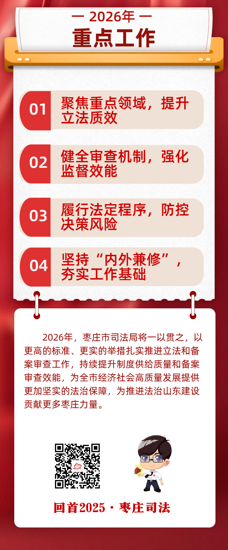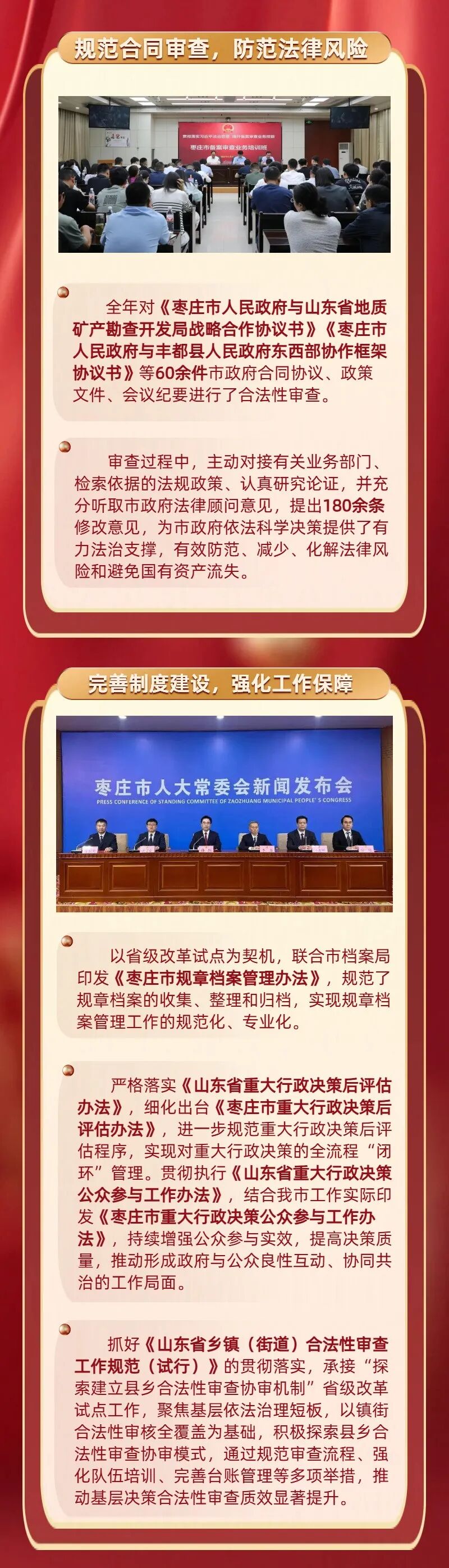 编者按 回望来路,只争朝夕。法治筑根基,实干谱新篇。2025年,枣庄市司法局始终以习近平法治思想为指引,锚定市委、市政府中心工作,紧扣“法治枣庄”建设主线,坚守司法行政初心使命,在全面依法治市、法治政府建设、公共法律服务、基层社会治理、机关党的建设等各个领域深耕细作、奋勇争先,交出了一份有力度、有温度、有实效的法治答卷。 为回望耕耘之路,展现奋进成果,我们特开辟“回首2025·枣庄司法”专题栏目,陆续刊发全市司法行政系统各项工作的实践成效与经验做法。这既是对2025年工作的梳理总结,更是对未来法治建设的蓄力奋进。 精准立法提质 严格审查增效 夯实高质量发展法治根基