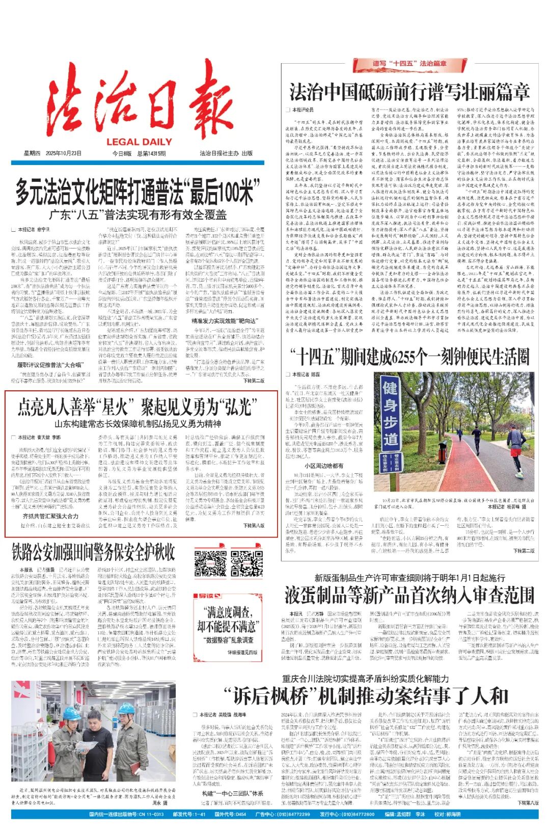 浓烟烈火弥漫,他们在全无防护的情况下徒手爬楼,将身处生死一线的孩子成功救下;突遇货梯意外,他们从300斤坠梯上勇救同事,青春年华遭遇截肢却无怨无悔;面对深不可测的井底,他们不顾个人安危下井救人……《法治日报》记者近日从山东省委政法委了解到,近年来,山东累计确认表彰9700余人,90人获得国家级见义勇为荣誉,1240人获省级称号,27人先后荣登中央政法委“见义勇为勇士榜”,见义勇为精神得到广泛弘扬。据介绍,山东建立健全由党委政法委牵头、各有关部门共同参与的见义勇为工作机制,构建完善党委领导、政法协调、部门协同、社会参与的见义勇为工作格局,推动见义勇为工作纳入平安建设、法治建设和精神文明建设等总体部署,为见义勇为事业发展提供坚强保证。各级见义勇为基金会推动各地将见义勇为工作经费、奖励抚恤资金等纳入本级财政预算,按照与财力增长相适应的原则,形成稳定增长机制。鼓励发展见义勇为社会公益性组织,动员更多社会组织、公司企业、公民个人投身到见义勇为事业中来。探索在大型企事业单位、社会组织中建立见义勇为工作联络点,及时总结推广经验做法,确保工作纵向到底、横向到边、覆盖广泛。健全规章制度和工作流程,建立见义勇为人员信息数据库和管理平台,推动工作更加规范化、标准化、精细化,不断提升工作效率和服务水平。目前,全省见义勇为组织持续壮大,省见义勇为基金会秘书处成立党支部,市级见义勇为基金会实现全覆盖,组建见义勇为协会等基层组织161个。省市财政部门每年拨付见义勇为专项基金,各级基金会积极开展公益活动募集社会资金,全省资金总量4.23亿元,为见义勇为工作开展提供了坚实保障。今年3月31日,是淄博市见义勇为市民李松林全家倍感荣光的日子。这一天,淄博市委政法委、市见义勇为基金会相关负责人来到李松林家,授予其家庭全市第一个“见义勇为模范之家”牌匾。据了解,李松林在苏州勇救落水青年被媒体报道后,淄博市委政法委、市见义勇为基金会了解到其父亲、弟弟也曾多次冒险救人分别被表彰的情况后,上门为其授牌并奖励两万元。让见义勇为模范“脸上有光、心里有暖、生活有底”。近年来,山东探索建立“见义勇为发生即发现、发现即确认、确认即表彰、表彰即宣传”的工作机制,充分利用网络新媒体平台,拓展见义勇为事迹线索、工作建议的收集方式和渠道,确保见义勇为行为第一时间发现、见义勇为精神第一时间弘扬。研究细化见义勇为行为确认标准,建立公开透明、规范严谨的评审机制,广泛发动群众参与评议,自觉接受社会各界监督,确保英模名副其实、表彰实至名归。及时认定褒奖,确保对事实清楚、证据充分、反响强烈的见义勇为事迹典型及时予以确认、表彰、奖励。如何大力弘扬见义勇为精神?山东统筹运用媒体资源,全方位开展舆论宣传,定期组织见义勇为英模事迹报告巡讲,打造山东见义勇为宣传品牌。积极推动见义勇为精神进课堂、进社区、进工厂、进机关,融入公民道德建设工程和新时代文明实践中心建设,树立人人崇尚见义勇为、人人支持见义勇为、人人敢于见义勇为的良好社会风尚。同时,在关心关爱见义勇为人员上持续加力。研究制定山东省见义勇为人员权益保障政策法规,确保见义勇为人员在医疗救治、伤残抚恤、就业援助、子女教育、住房保障、法律援助等方面得到帮助。对因见义勇为导致家庭生活陷入困境的人员开展精准帮扶。对致残人员和牺牲人员家庭,探索开展常态化抚恤补助,努力提高保障水平。在青岛市,“大爱之城 见义思青”城市品牌成为扎实推进见义勇为事业高质量发展、引领社会风气向上向善向好的有效载体。青岛市制定见义勇为表彰奖励和救助抚恤暂行办法,出台见义勇为人员免费治疗、救助帮扶、评烈优抚等一系列政策措施。探索建立多元化资金募集和帮扶救助模式,将无偿捐献造血干细胞志愿者纳入见义勇为奖励范畴,创设“见义勇为扬正气 慈善救助送温暖”项目,向生活困难的见义勇为人员及其亲属发放救助金255人次共330.8万元。让见义勇为成为新时代社会风尚,成为人民群众的道德准则、行为准则、自发选择。在全省“一盘棋”统筹部署下,各地因地制宜,以打造特色品牌为载体聚起磅礴的正义力量。菏泽市打造“大义菏泽”城市新名片,以见义勇为事业高质量发展服务经济社会发展。健全即时高效的表彰宣传机制,构建了以现场目击者、志愿者、保安员、网格员收集上报与大数据平台监测相结合的“五位一体”信息收集渠道,努力做到见义勇为行为发生即发现。2021年以来,全市共表彰见义勇为人员700余人次,发放奖金、慰问金400余万元。聊城市打造见义勇为宣传品牌,创作了《聊城见义勇为之歌》主题曲,摄制了《义涌水城》视频宣传片,编纂了《义涌水城》群英谱系列丛书,明确每年10月22日为全市见义勇为集中宣传日。开设“聊城市见义勇为基金会”“义涌水城”新媒体账号,累计发布宣传内容1800余篇次,让正能量拥有大流量。枣庄市积极争取中央和省级“爱心账户”“爱心圆梦工程”子女助学和重大疾病医疗救助等帮扶救助项目,建立解难事、办实事、助贫困、献爱心“四位一体”的关爱激励机制,设立“爱心账户”,开展春节等重要节日走访慰问活动。2017年以来,共