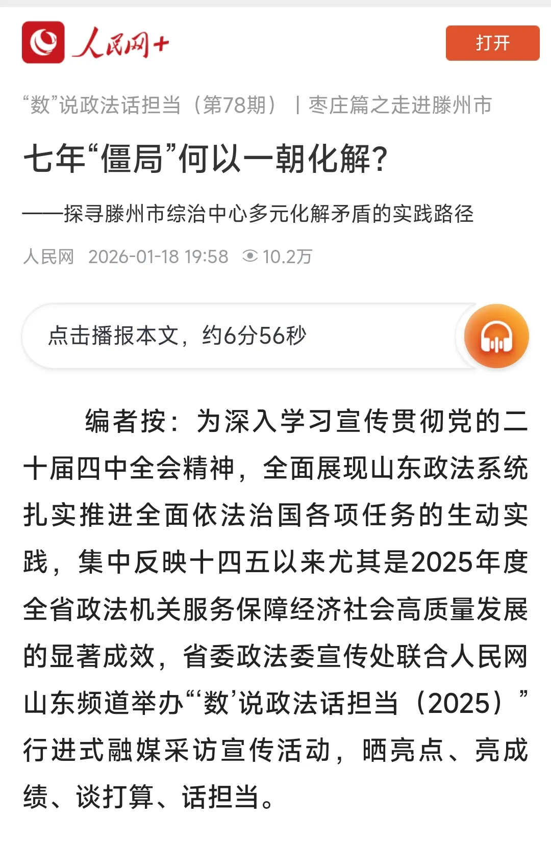 1月18日,人民网以《七年“僵局”何以一朝化解?》为题,刊发滕州市综治中心矛盾纠纷多元化解经验做法。全文如下: 编者按:为深入学习宣传贯彻党的二十届四中全会精神,全面展现山东政法系统扎实推进全面依法治国各项任务的生动实践,集中反映十四五以来尤其是2025年度全省政法机关服务保障经济社会高质量发展的显著成效,省委政法委宣传处联合人民网山东频道举办“‘数’说政法话担当(2025)”行进式融媒采访宣传活动,晒亮点、亮成绩、谈打算、话担当。 本期报道走进枣庄滕州市,聚焦市综治中心以资源整合、分级过滤、数据赋能破解矛盾化解难题的生动实践,看七年“僵局”如何一朝化解,探寻县级综治中心规范化建设的“滕州路径”。 在滕州,市民任先生因为一间储藏室,和开发商、物业公司僵持了整整7年。储藏室实测面积比预测面积多出8平方米,是否补差价、能否办房产证、物业费交不交,三方各执一词,问题层层卡死。看似无解的“三难”境地,在滕州市综治中心找到了出口。 滕州市综治中心调解员多方奔走、协商后,事情出现转机。开发商承担一半差价并协助办理房产证,任先生补齐另一半差价及物业费用,物业公司放弃违约金。这起多年未解的“老大难”在滕州市综治中心画上句号。类似的变化,正是滕州市推进综治中心规范化建设带来的直观成效。 资源集成 办事只需“一扇门” 任先生第一次来到滕州市综治中心时,并不知道具体该找哪个部门。让他意外的是,在这里他只需要把事情讲清楚,剩下的流程由工作人员接力完成。 滕州市按照“多中心合一、一中心多用”原则,建成2600平方米综治中心阵地,设置引导受理区、多元化解区和指挥调度区,调解、复议、仲裁、诉讼、法律服务等功能集中运行。 “过去群众反映问题,常常要在不同部门之间来回跑,现在是我们内部流转。”滕州市综治中心副主任刘兴锋介绍,目前中心整合21个部门力量,采取“常驻+轮驻+随驻”方式进驻,法院委托调解中心、行政复议、物业纠纷专班、治理欠薪专班、7个行业性专业性调委会、3个名人调解工作室等45名人员常驻中心,统一由市综治中心管理。这种实体化运行,让“有人接、有人办、有人盯结果”成为常态。 分级过滤 专班攻坚“老大难” 在综治中心,任先生的纠纷被第一时间分流到物业纠纷调解专班。 “物业类纠纷往往时间跨度长、成因复杂,如果简单劝和,很容易反复。”物业纠纷专班负责人王栋说,专班会从合同约定、法律责任和现实情况入手,逐项梳理争议焦点,再组织协商。 这背后,是滕州市构建的三级分调机制。一般矛盾在村居化解,复杂问题由镇街跟进,久拖未决或疑难矛盾则由市综治中心牵头调解,形成“逐级过滤、兜底解决”的工作链条。 行业性专业性调委会合力化解复杂疑难案件 王瀚德摄 对物业、劳动争议等高频领域,滕州市实行“专班化”调解。2025年以来,物业专班、劳动争议专班、治理欠薪专班共化解矛盾纠纷1059件;市综治中心牵头对“钉子案”实行集中攻坚,牵头化解重大疑难矛盾52件;全市共受理矛盾纠纷9079件,调处结案9064件,通过非诉讼方式解决的案例占比达到55%,越来越多的矛盾在进入诉讼前得到解决。 数据赋能 预警跑在风险前 纠纷解决在“事后”,而综治中心的另一项重要工作,是尽量把问题消解在“事前”。 在矛盾纠纷多元化解线上平台开展数据分析预警研判 王瀚德摄 依托综治中心,滕州市整合视频监控、网格化管理等资源,将21000余个视频监控点位统一接入“雪亮工程”平台,对1180个村居和重点部位进行网上巡查。同时,建立人房信息管理系统,采集更新55.3万条房屋信息,对各类重点人员实行精准管理。 “通过数据分析,可以提前发现风险苗头。”市综治中心工作人员刘红武介绍,2025年以来,滕州市通过研判预警机制,累计预警各类风险112件,下发督办函48件,推动问题早发现、早介入。 数据汇聚之下,“e呼善应”治理模式不断完善。该模式获得“中国数字社会治理优秀案例,并分别入选2024年度、2025年度互联网助力经济社会数字化转型特色案例等荣誉,也为县级综治中心规范化建设提供了有力支撑。 从一起七年纠纷的解决,到一套机制的持续运转,滕州市以市综治中心为支点,把资源整合到一线,把矛盾化解在基层,逐步探索出一条可复制、可推广的基层社会治理路径。 记者手记 在滕州市综治中心采访时,记者最直观地感受不是“机制有多复杂”,而是事情“真的被解决了”。一起拖了七年的物业纠纷,在这里被一项项拆解、逐步化解,背后是部门协同、专班攻坚和数据支撑形成的合力。基层治理的成效,往往不体现在口号里,而体现在群众少跑了多少路、问题少拖了多少年。这或许正是县级综治中心规范化建设最有分量的意义所在。 (“数”说政法话担当融媒采访团成员、山东法制报记者陈俊如)
